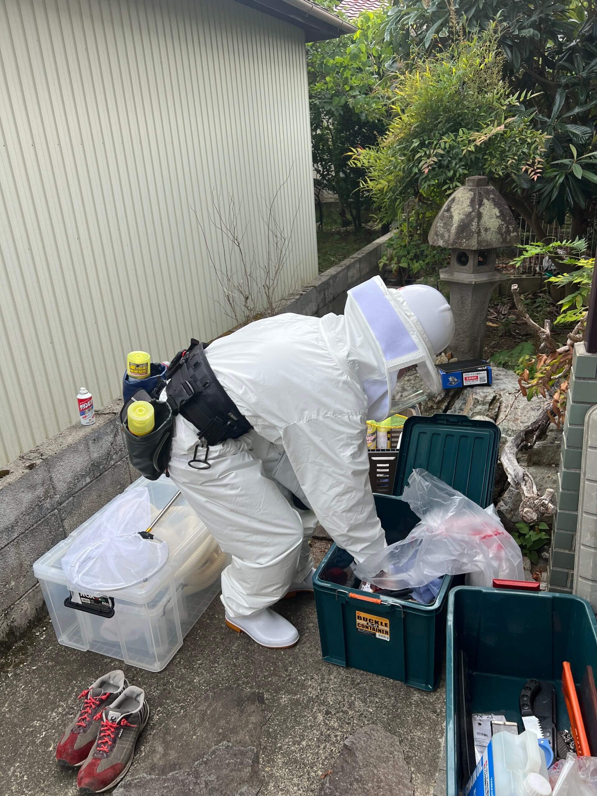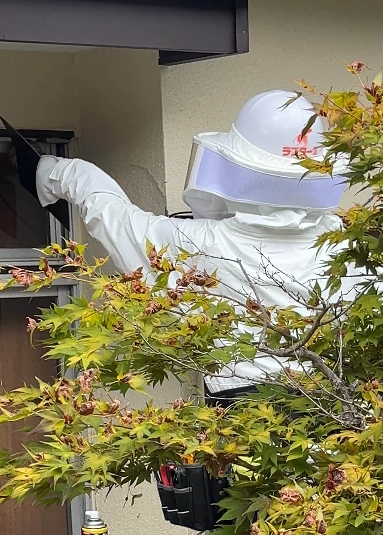こんにちは。GOEN代表の小口です。 先日、長野市内で遺品整理をご依頼いただいたお宅で、庭の軒先にスズメバチの巣を発見しました。 私たちGOENは、ただ遺品を整理するだけでなく、現場環境の安全確保も非常に大切にしています。 というのも、昨年はスタッフの塚田と渡辺がハチに刺されたという苦い経験があり、二度と同じことが起きないよう安全管理を徹底しているからです。 今回も、スタッフの安全を守り、作業を安心して進めるために、協力会社の村上さんに駆除を依頼し、私・小口が立ち会いのもとで対応しました。 [caption id="attachment_3232" align="aligncenter" width="1920"]村上さんの防護服姿 ハチの巣 防護服 スズメバチ[/caption] スズメバチの駆除中 幸いにも、まだ巣が大きくなる前だったため、迅速かつ安全に取り除くことができました。