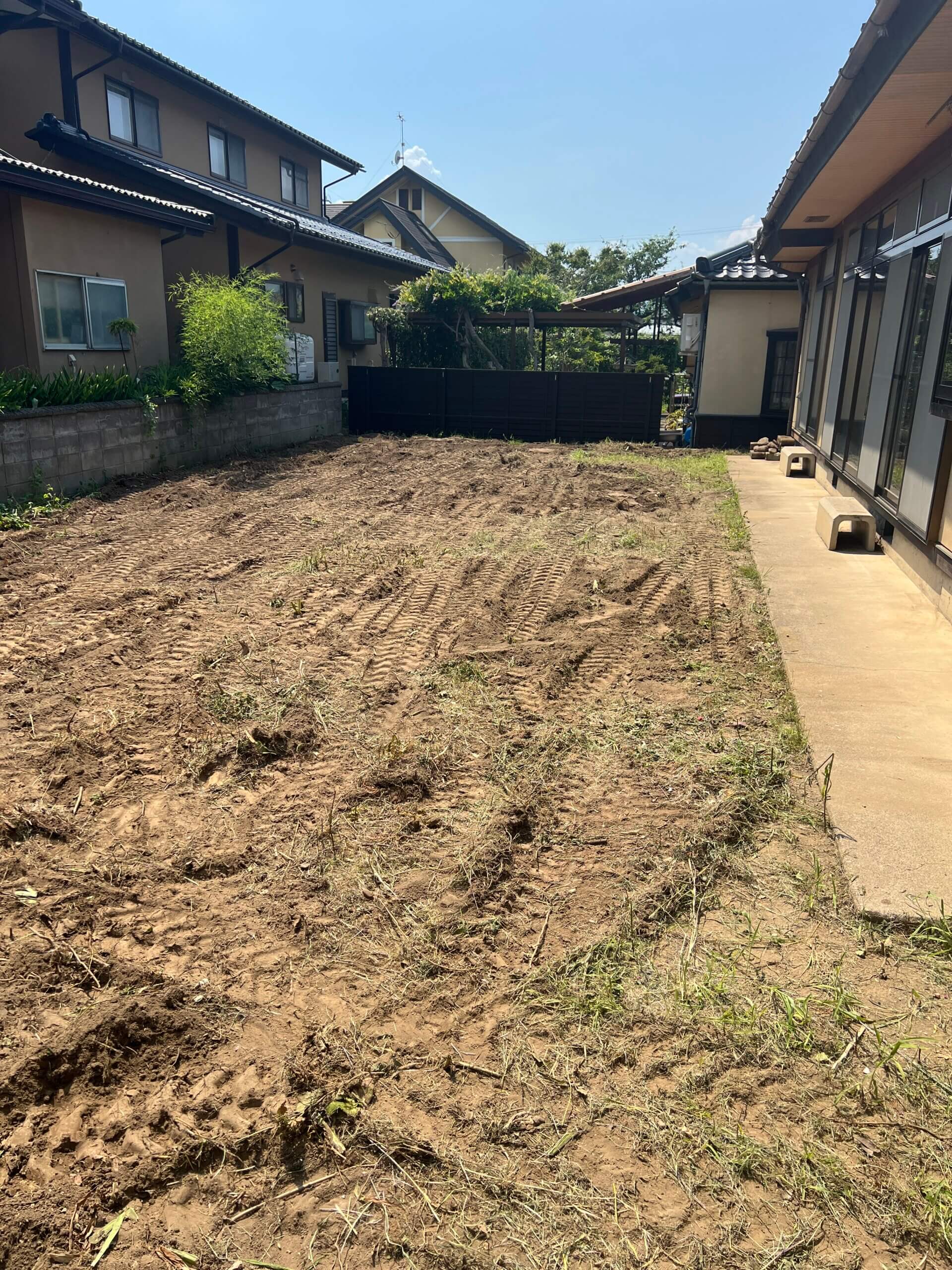 しっかりと根まで掘り起こし、不要な木々を処理した上で、地面を平らに整地して作業完了です。