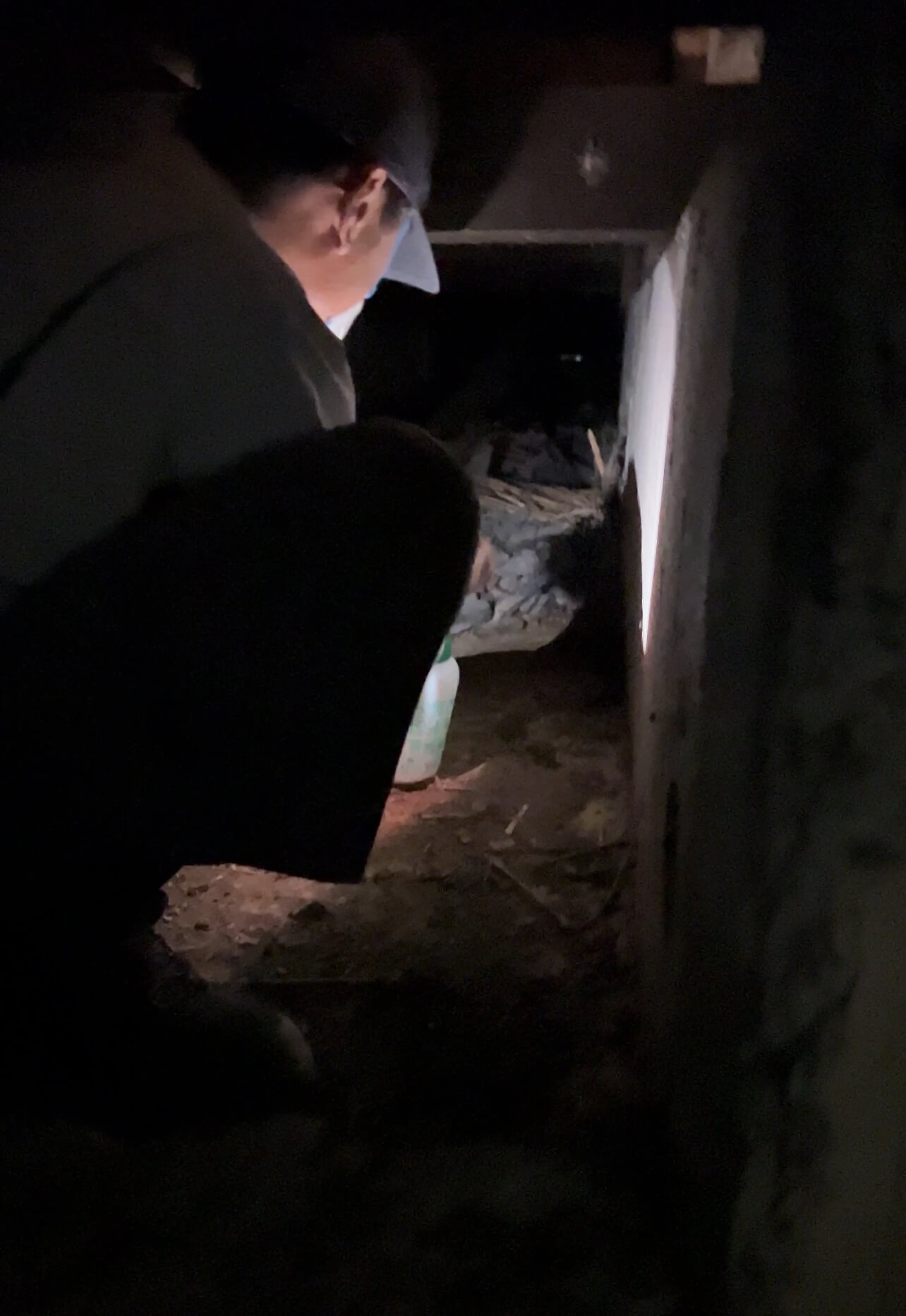 現地に到着し、早速床下に潜入。中は真っ暗で、ライトがなければ一歩も進めません。