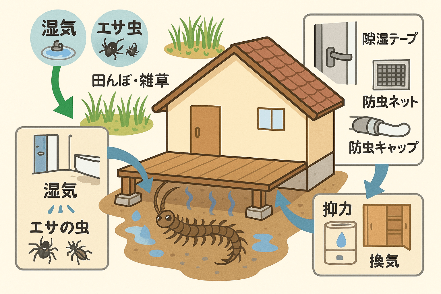 床下からの害虫(ゲジゲジ・ムカデなど)は「湿気」や「エサ」が原因です。