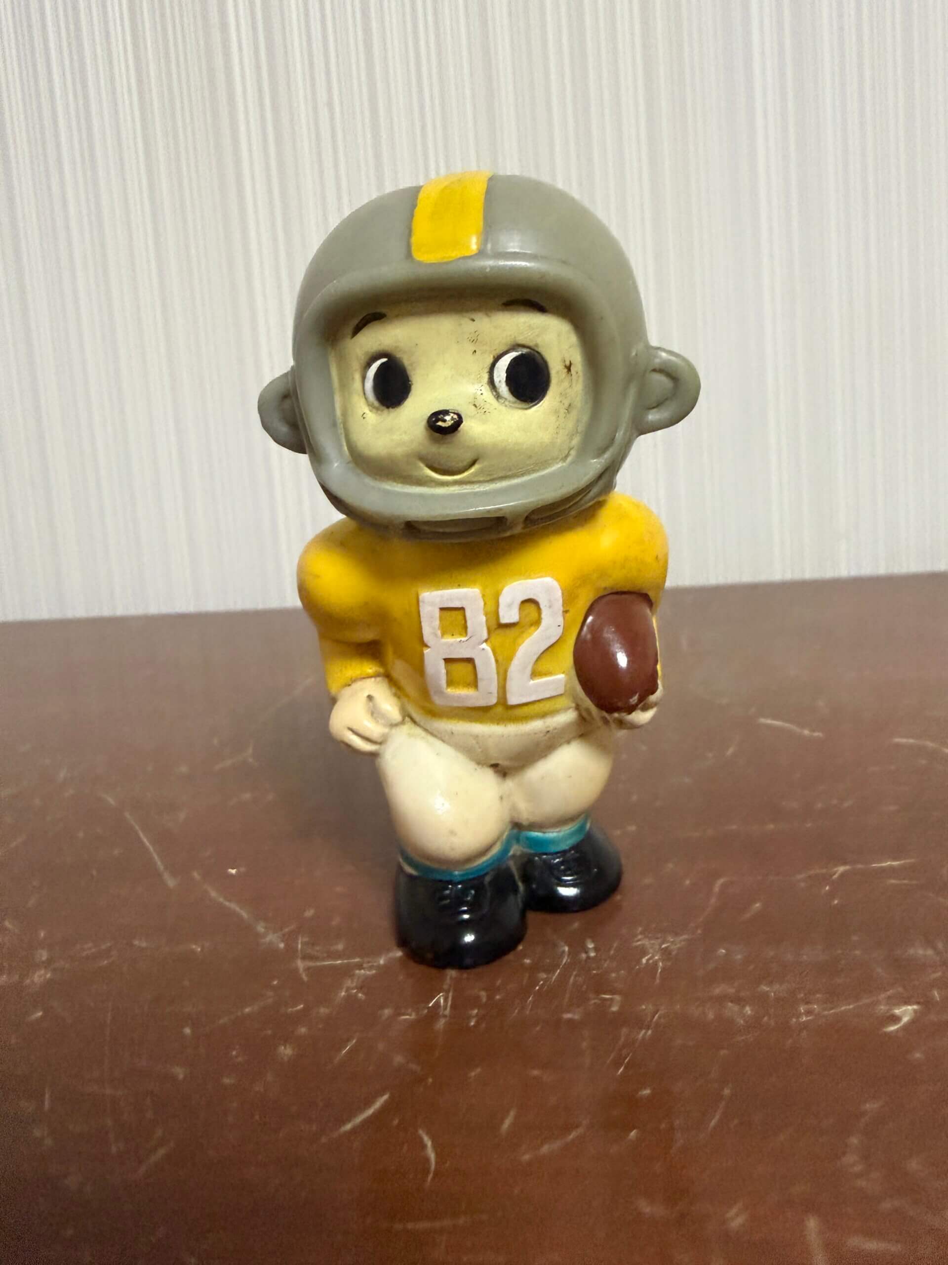 黄色いユニフォームにヘルメット姿、手にはラグビーボールのようなものを抱えた陶器の貯金箱です。