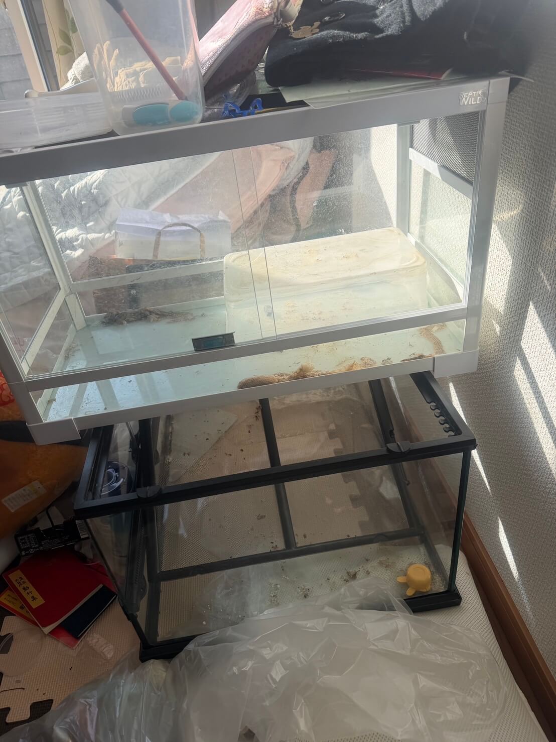 部屋中に舞う動物の毛、放置されたペット用品、生きた魚が入ったままの水槽……